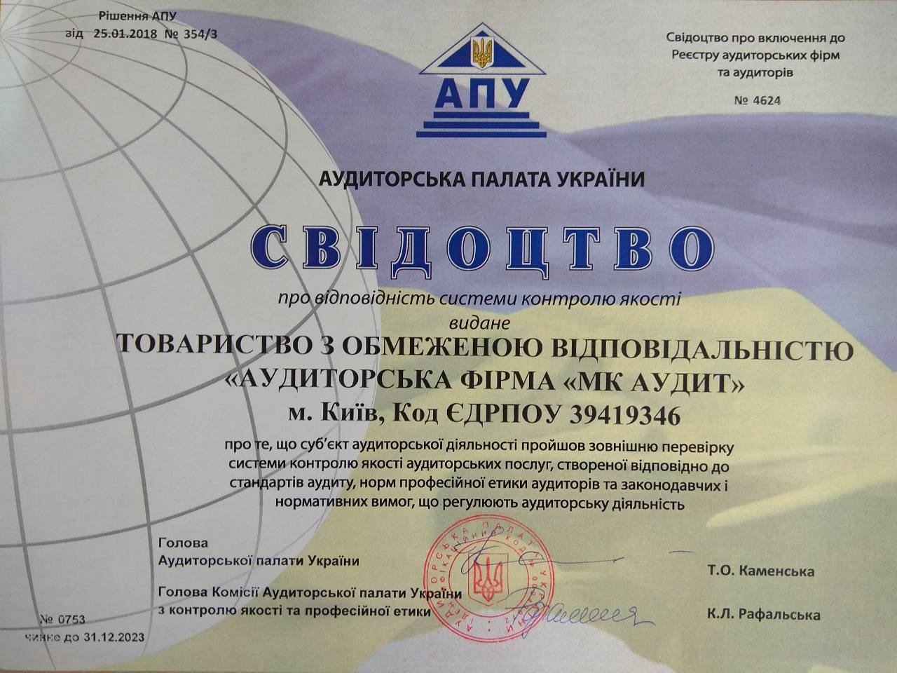 Аудиторская фирма «МК Аудит», ( г.Киев) подтвердила свое высокое качество оказания услуг, пройдя контроль качества от Аудиторской Палаты Украины, подтверждающий, что система контроля качества аудиторских услуг, создана в соответствии со стандартами аудита, нормами профессиональной этики аудиторов и законодательных и нормативных требований, которые регулируют аудиторскую деятельность. Срок действия свидетельства 5 лет.