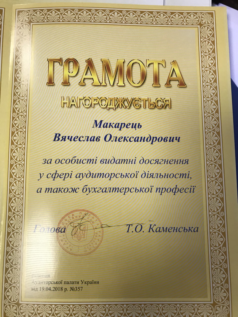 Директор Аудиторской фирмы «МК Аудит» награжден Грамотой Аудиторской Палаты Украины ( за личные выдающиеся достижения в сфере аудиторской и бухгалтерской деятельности ) .